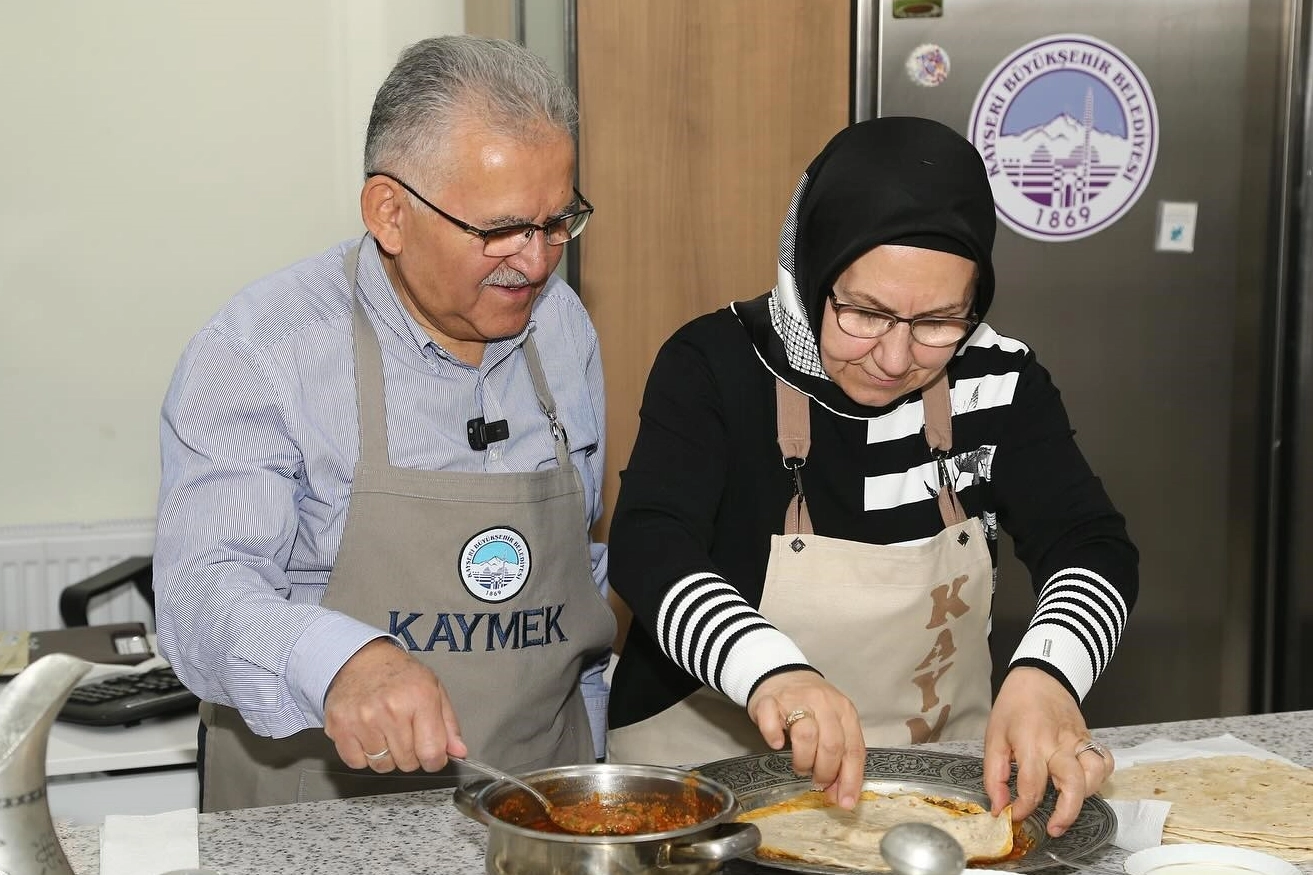 Kayseri Büyükşehir Belediyesi’nin mesleki eğitim ve kültür faaliyetlerini gerçekleştiren kuruluşu KAYMEK, evli çiftleri Kayseri’nin zengin gastronomi kültürü içerisinde yer alan yağlama yapımı etkinliği ile buluşturdu. Ücretsiz olarak vatandaşların hizmetine sunulan KAYMEK İle Öğreniyorum Atölyesi bünyesindeki ‘Eşim ve Ben Mutfakta’ etkinliği, KAYMEK Akademi tesislerinde gerçekleştirilirken, etkinliğe Büyükşehir Belediye Başkanı Dr. Memduh Büyükkılıç da eşi Dr. Necmiye Büyükkılıç ile birlikte katıldı. Ceketini çıkarıp, mutfak önlüğünü giyen Başkan Büyükkılıç, eşi Dr. Necmiye Büyükkılıç ile yağlama yaptı. Büyükkılıç, burada yaptığı açıklamada; KAYMEK’in 6’ncı üniversite gibi hizmet verdiğini vurgulayarak, “Bu alanda da meslek edindirme kurslarımız hem hobi mantığında hem gelir temin etmek isteyip, bütçesine katkıda bulunmak isteyenler için fayda sağlıyor.