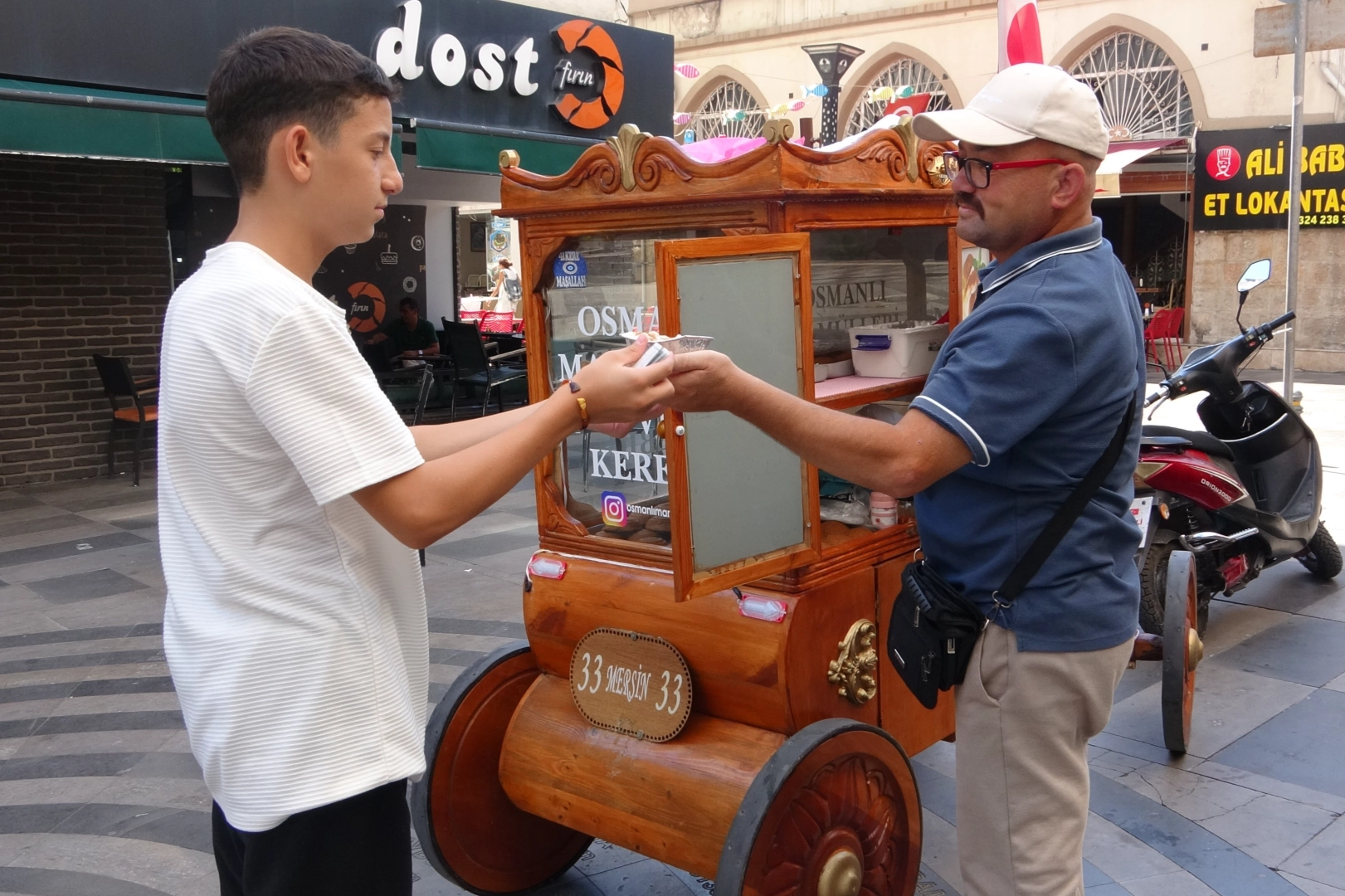 Kerebiç ve mamulleri kendi hazırlıyorTümer, üzerinde 'Osmanlı mamulleri ve kerebiç' yazan tezgahında, evinde hijyenik şartlarda hazırladığı cevizli ve Antep fıstıklı kerebiç ile cevizli ve hurmalı mamuller sattığını söyledi. Cevizli kerebici kilosu 350 TL, Antep fıstıklı kerebici ise 460 TL'den satışa sunduğunu ifade eden Tümer, "Kerebiç yaparken Antep fıstığını parça şeklinde değil de tüm ekliyorum. Cevizli mamuller ise üzerine eklediğim kaymak ve tarçınla çok güzel bir lezzete sahip oluyor" diye konuştu.