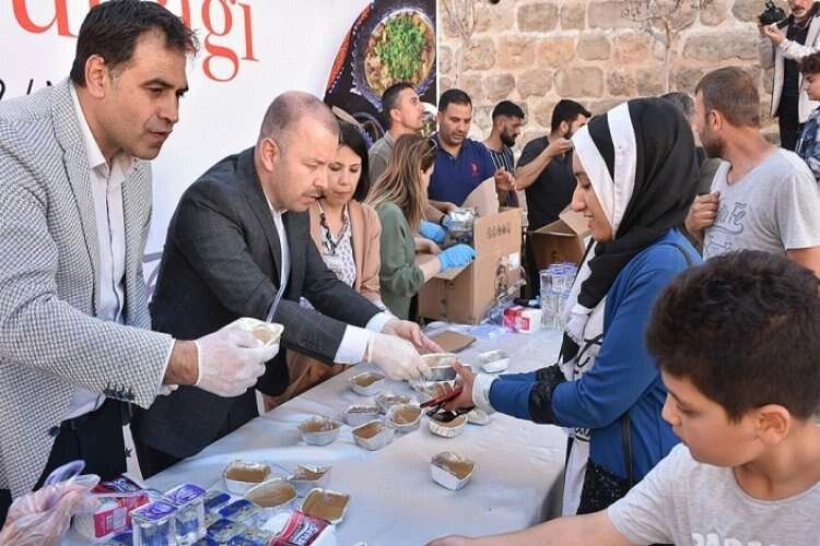 Tarihi Kız Meslek Lisesi bahçesine kurulan standa Mardin Büyükşehir Belediyesi Genel Sekreteri Murat Süzen ve belediye personeli hazırlanın Harire Dulamaz Tatlı’sını vatandaşlara tek tek ikram ettiler.