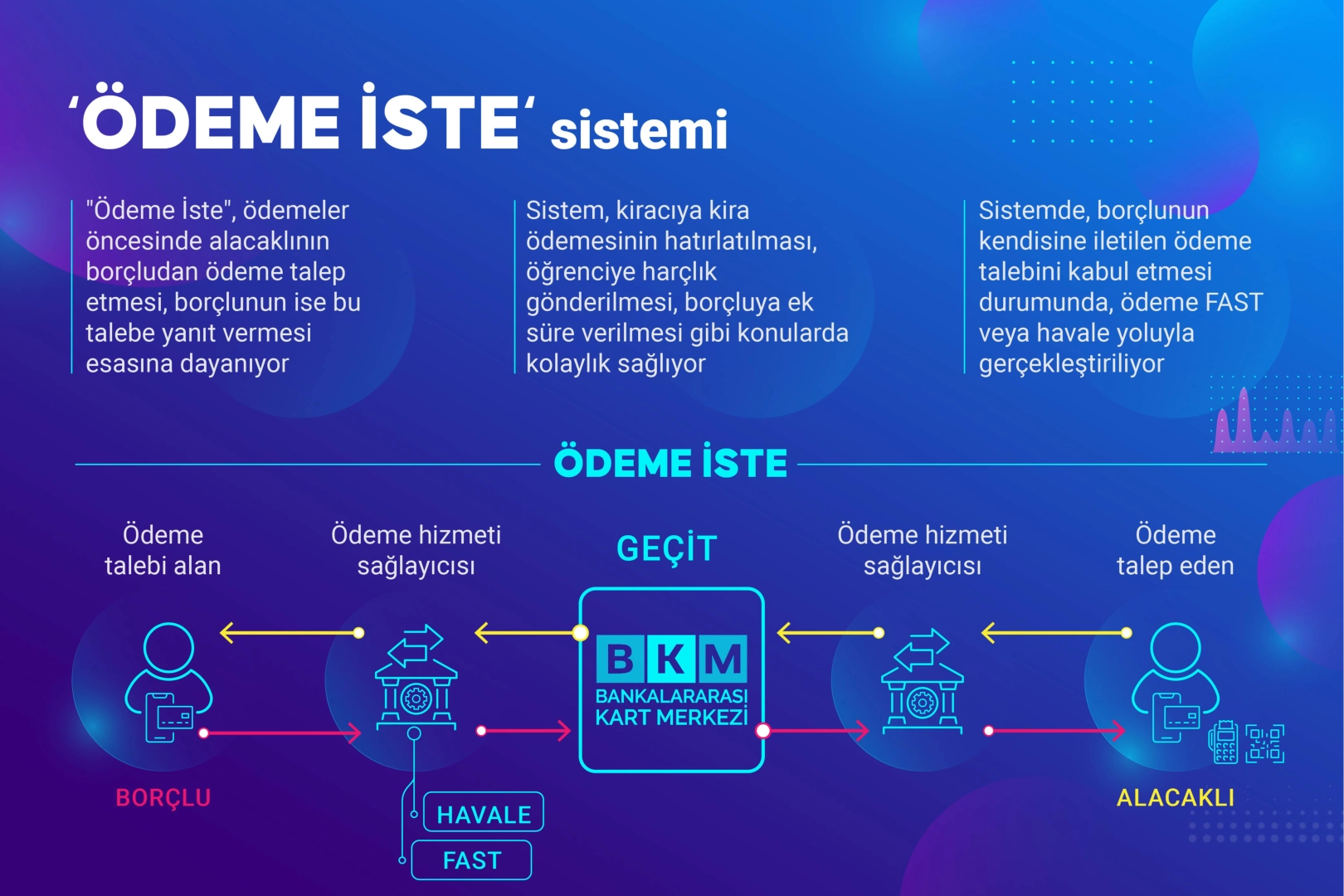 "Ödeme İste" sistemine ilişkin merak edilenler "Ödeme İste" sistemi nedir?Sistem, ödemeler öncesinde alacaklının borçludan ödeme talep etmesi, borçlunun ise bu talebe yanıt vermesi esasına dayanıyor. "Ödeme İste", bir ödeme sistemi ve ödeme aracı/kanalı değil, ödeme öncesi kullanılan bir altyapı özelliği taşıyor.