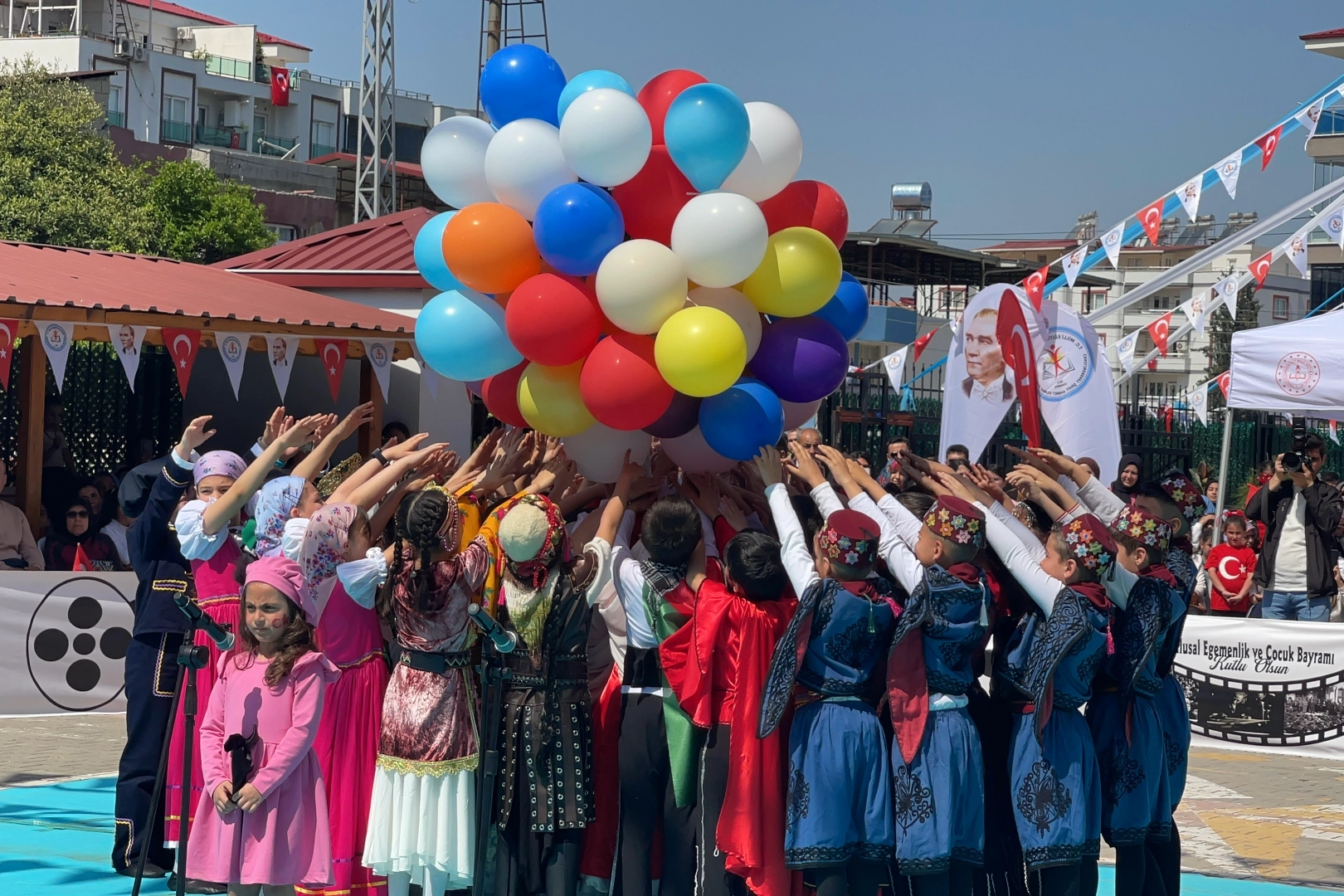 Osmaniye’de, 23 Nisan Ulusal Egemenlik ve Çocuk Bayramı düzenlenen çeşitli etkinliklerle büyük bir coşkuyla kutlandı. Öğrencilerin farklı dünya kültürlerini tanıtan halk dansları performansları izleyicilerden tam not alırken, Filistin halk dansları gösterisinin finalinde açılan "Savaşlar dursun dünya çocuklara kalsın" yazılı pankart törene damga vurarak duygu dolu anlar yaşattı.