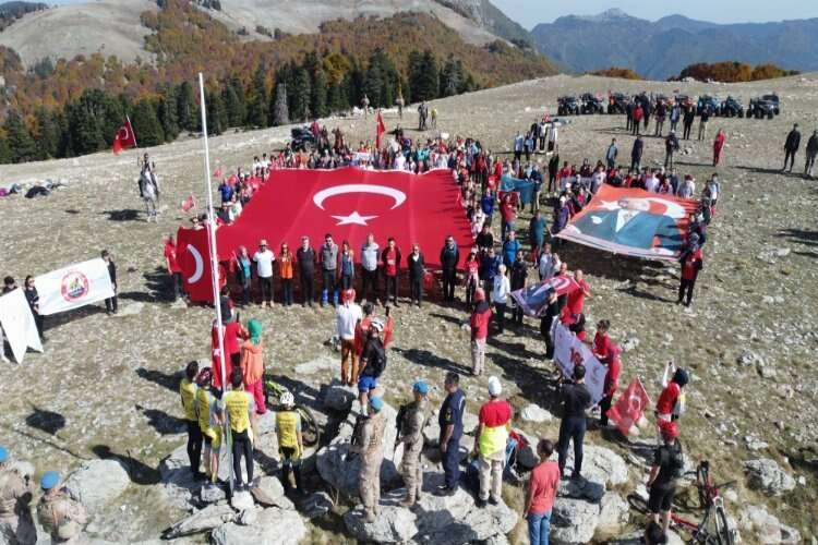 2 bin 200 metre yüksekliğindeki zirvede toplanan grup, İstiklal Marşı'nı okudu, zirveye diktikleri 6 metre uzunluğundaki göndere Türk bayrağını çekti.