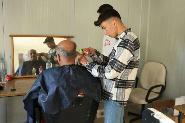 Osmaniye Halk Eğitimi Merkezince Fakıuşağı Mahallesi'ndeki eğitim yerleşkesine konulan konteynerde, usta öğretici ve öğrenciler ile gönüllü kuaförler, depremzedeleri tıraş edip saç bakımlarını yapıyor.