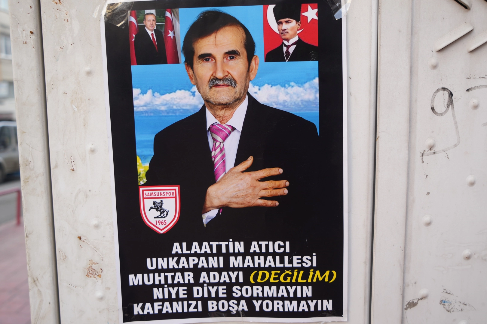 İlkadım ilçesi Unkapanı Mahallesi'nde esnaflık yapan Alaattin Atıcı'nın çevreye yapıştırdığı afişler görenlerin dikkatini çekiyor. Birçok muhtar adayının afişinin bulunduğu mahallede ‘Unkapanı Mahallesi muhtar adayı (değilim), niye diye sormayın, kafanızı yormayın' şeklinde yazı yazarak elektrik panoları ve dükkanına afiş yapıştıran Alaattin Atıcı, insanların yüzünde tebessüm oluşturmak istediği için böyle bir şey yaptığını söyledi.