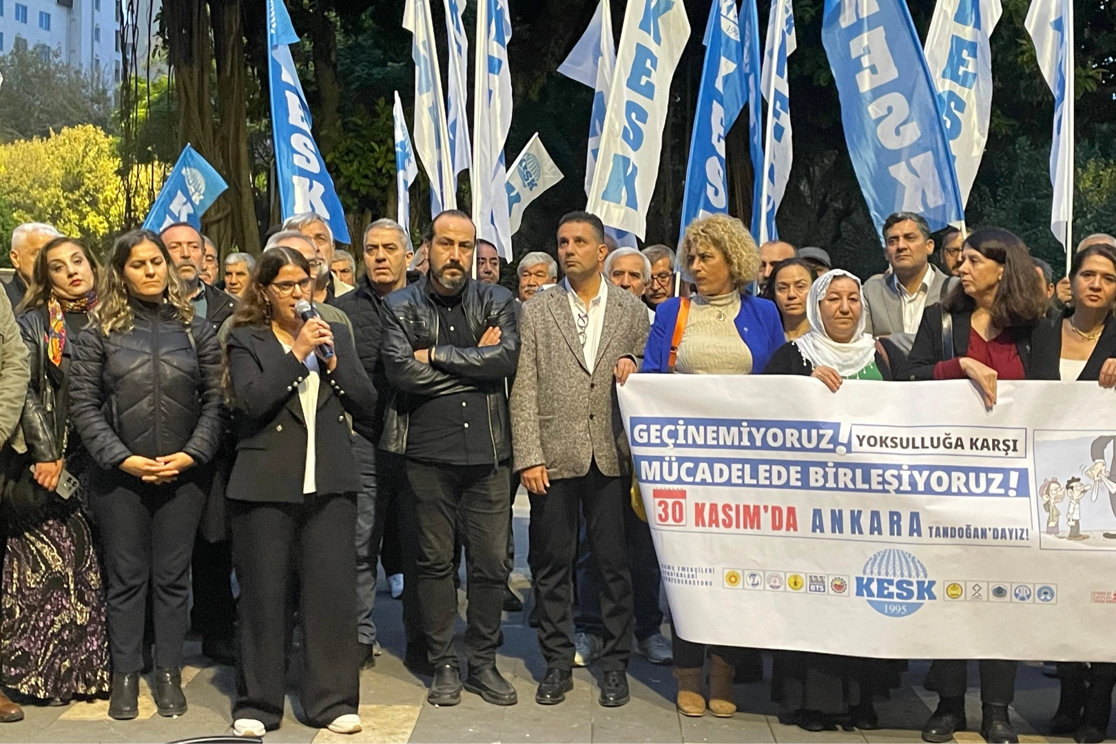 Güney, “Biz bu yoksullaşma süreci içerisinde her ne kadar bu yoksullukla mücadelede KESK olarak çağırıcı olmuş isek ama şiarımızdan da anlaşıldığı bu derinleşen yoksulluk sadece kamu emekçilerinin kamu çalışanlarının sorunu değil toplumun çok geniş kesimini ilgilendiren, derin bir ekonomik sorunla karşı karşıyayız. Dolayısıyla da biz diyoruz ki bu yoksullukla mücadelede gelin hep birlikte birleşelim, birlikte mücadele edelim” dedi.