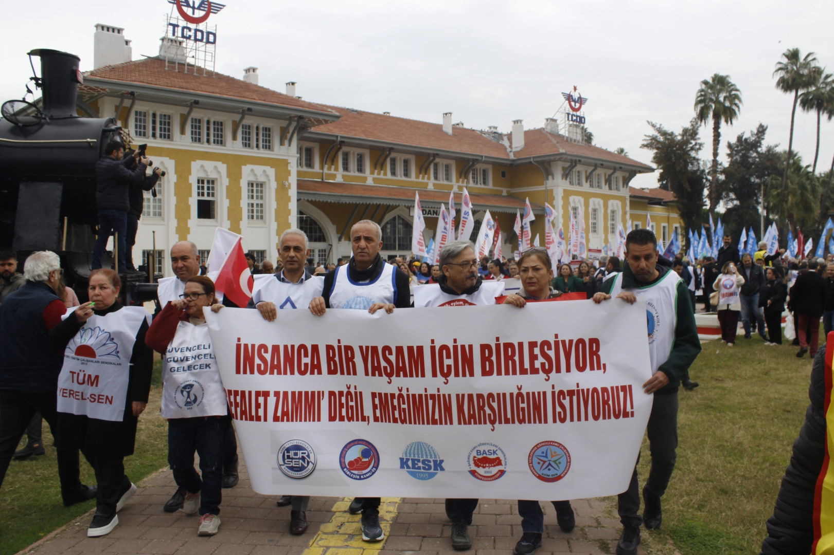 “Emeğimize yapılan zam, toplumun geniş kesimlerini yaralamaktadır”Birleşik Kamu-İş Konfederasyonu Adana İl Temsilcisi Hakan Şen, eylemde yaptığı açıklamada, kamu emekçilerinin maaşlarına yapılan yüzde 11,54’lük zammın yetersiz olduğuna dikkat çekerek şunları söyledi: “Emeğimizin onurunu korumak için mücadele bayrağını yükseltiyoruz. Kamu emekçilerinin maaşlarına yüzde 11,54 gibi trajikomik bir zam uygulamak, alın terimize ve emeğimize yapılmış büyük bir hakarettir. Üstelik bu hakaret yalnızca kamu emekçilerini değil, toplumun geniş kesimlerini de derinden yaralamaktadır. Ekonomik krizle her gün biraz daha ağırlaşan hayat koşulları, temel ihtiyaçlarımızı bile karşılayamayacak duruma gelmemize yol açmıştır.”