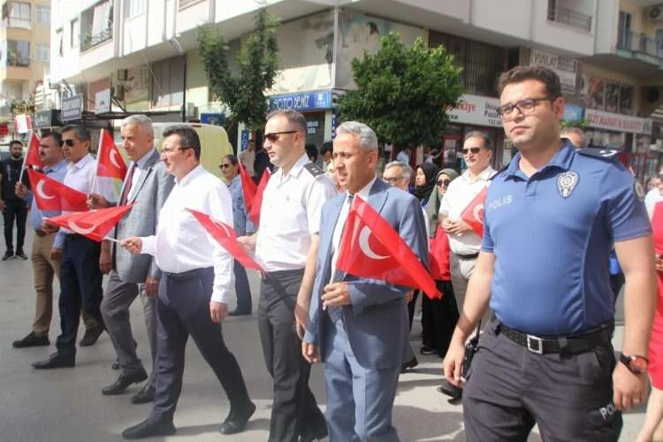 Yunus Emre Anadolu Lisesinin bando takımı eşliğinde yapılan yürüyüşte öğrenciler ellerindeki bayraklarla vatandaşlara görsel şölen yaşattı.