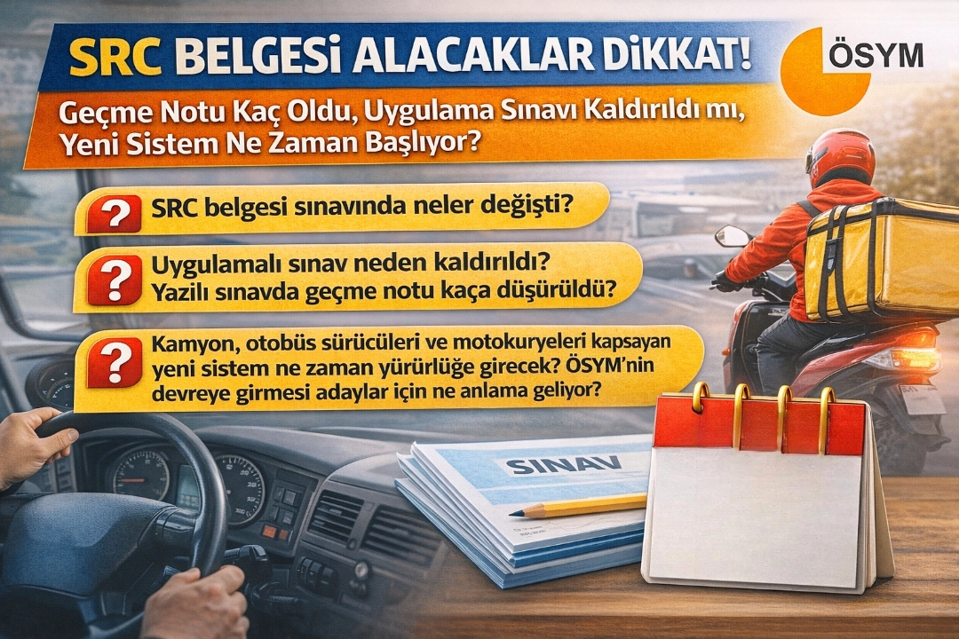 YENİ SİSTEM 1 MAYIS’TAN İTİBAREN GEÇERLİYapılan değişiklikler 1 Mayıs itibarıyla yürürlüğe girecek. Bu tarihten sonra SRC belgesi almak isteyen adaylar, ÖSYM tarafından düzenlenecek merkezi sınava katılmak zorunda olacak.Düzenleme; özellikle ticari taşımacılık sektöründe faaliyet göstermek isteyen sürücüler, kamyon ve otobüs şoförleri ile e-ticaret alanında çalışan motokuryeleri doğrudan ilgilendiriyor.