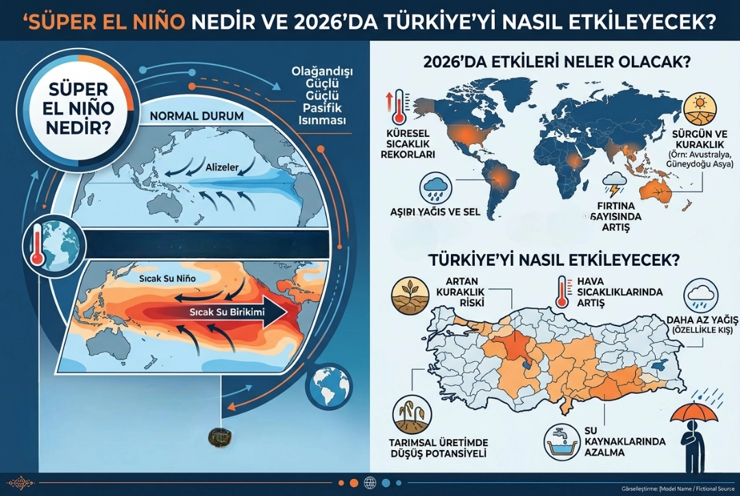 2026 SÜPER EL NİNO BEKLENTİSİMeteorolojik tahminlere göre 2026 yılının ikinci yarısından itibaren El Nino etkisinin güçlenebileceği öngörülüyor. Pasifik Okyanusu’ndaki deniz yüzeyi sıcaklıklarındaki artışın devam etmesi durumunda küresel ölçekte sıcaklık rekorlarının kırılması ihtimali bulunuyor.