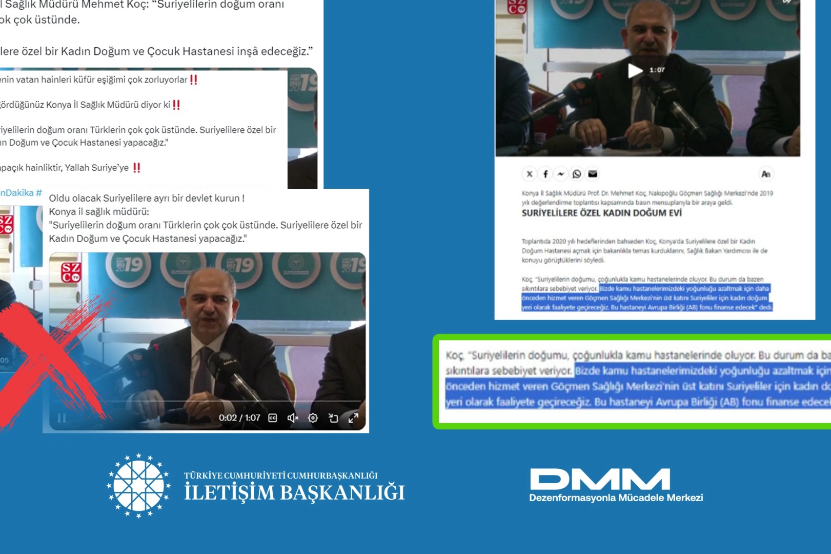 Cumhurbaşkanlığı İletişim Başkanlığı Dezenformasyonla Mücadele Merkezi, Konya'da Suriyeliler için özel bir Kadın Doğum ve Çocuk Hastanesi inşa edileceğine dair sosyal medyada yayılan asılsız iddialara ilişkin açıklama yaptı. Yapılan araştırmalar, iddiaların 2019 yılına ait bir toplantıdan cımbızlanarak alındığını ortaya koydu.