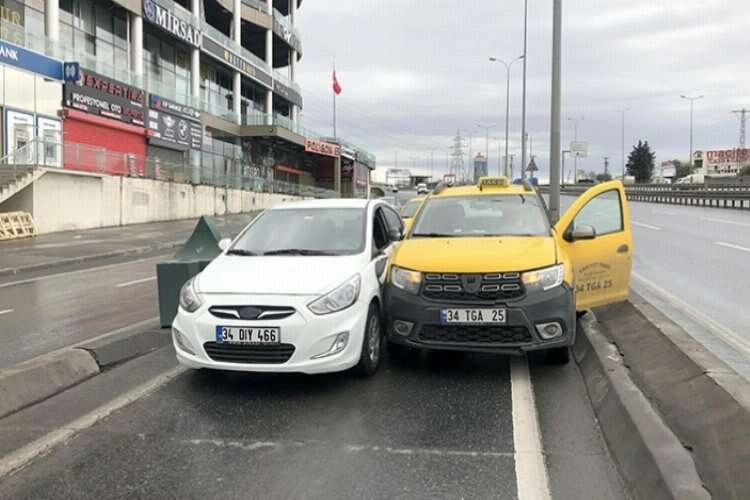 İSTANBUL (İHA) - E-5 karayolu Haramidere mevkiinde iki sürücü aynı anda yan yoldan ana yola bağlanmak istediği esnada birbirlerine yol vermeyince kaza meydana geldi. Sokağa çıkma kısıtlamasının olması nedeniyle boş olan yolda birbirini sıkıştıran araçlar ilginç görüntüler ortaya çıkardı.