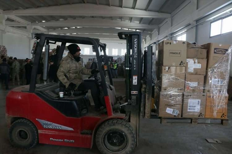 Elbistan'a gelen yardım malzemelerinin depolandığı alanlarda görev üstlenen güvenlik korucuları, gelen tırların boşaltılması, yardımların kayıt altına alınması ve malzemelerin sosyal marketlere dağıtılmasına kadar birçok konuda çalışmalara katılıyor.