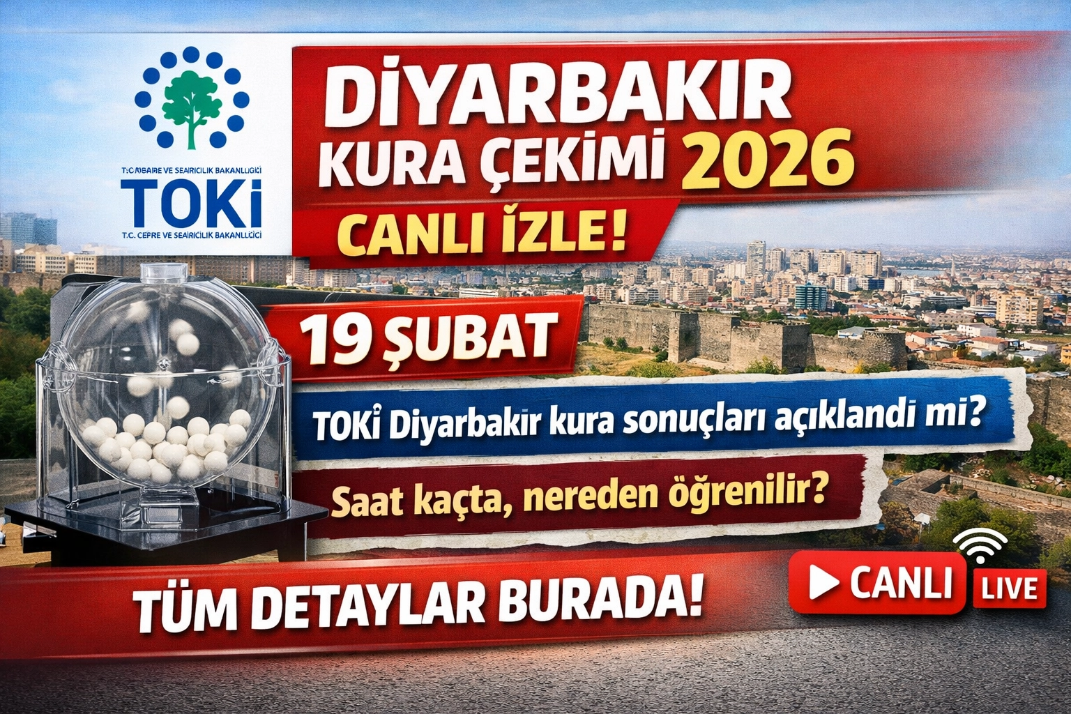 TOKİ DİYARBAKIR KURA ÇEKİMİ 2026 NE ZAMAN, SAAT KAÇTA YAPILDI?TOKİ Diyarbakır kura çekilişi 19 Şubat 2026 Perşembe günü saat 11.00’de Dicle Üniversitesi 15 Temmuz Kültür ve Kongre Merkezi Ziya Gökalp Salonu’nda noter huzurunda gerçekleştirildi. Çekiliş, başvuru sahipleri tarafından canlı yayın üzerinden takip edildi.