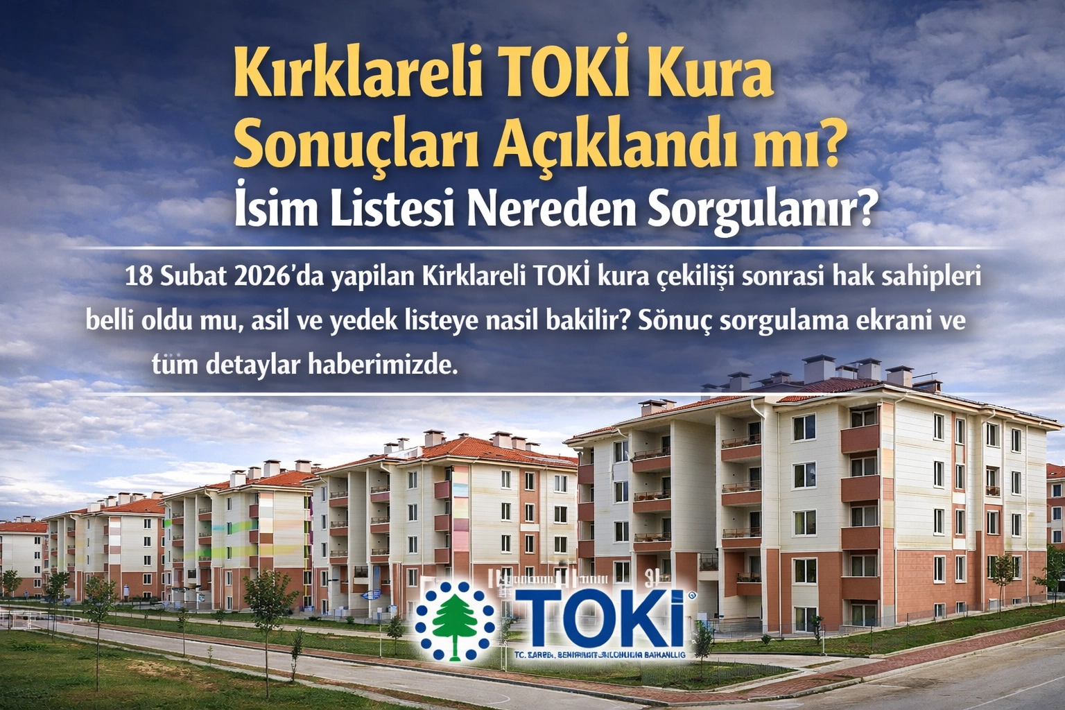 TOKİ KIRKLARELİ KURA SONUÇLARI 2026 SON DURUMToplu Konut İdaresi Başkanlığı (TOKİ) tarafından yürütülen 500 bin sosyal konut projesi kapsamında Kırklareli için düzenlenen kura çekilişi 18 Şubat 2026’da gerçekleştirildi. Noter huzurunda yapılan çekilişle 2.255 konutun hak sahipleri belirlenirken, başvuru yapan vatandaşlar sonuçların açıklanacağı sorgulama ekranını araştırmaya başladı. Kura çekilişi canlı yayınla takip edilirken, sonuçların sisteme yüklenmesiyle birlikte asil ve yedek isim listeleri erişime açılıyor.