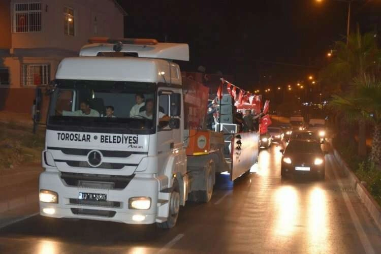 MERSİN(İLKHABER)- Marşlar ve şarkılar eşliğinde cumhuriyet tırı önceliğinde şehir turu atan kortej, ilçenin dört bir yanını gezdi. Korteje eşlik eden herkese Türk bayrağı hediye edilirken, çocuklar, gençler ve vatandaşlar da alkışlarıyla ve Türk bayraklarıyla Cumhuriyet Bayramını kutladı. Gece saatlerine kadar süren kutlamalarda Toroslar halkı hep birlikte saygı duruşunda bulunarak İstiklal Marşını okudu.