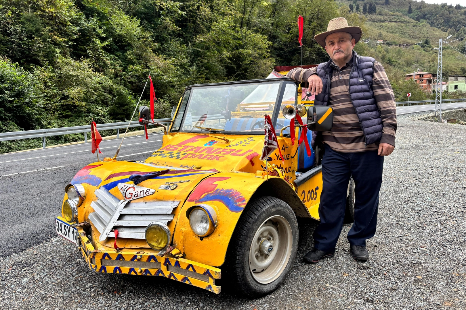 20 beygirlik motorlu ‘Zigana' ile dağ tepe demeden gezen Sabri Yavuz, "Ömrümün yarısı İstanbul'da geçti. Orada şoförlük yapıyordum. Kafamda hayallerim vardı. O zaman Formula pisti yapılmıştı. Bende ona uygun bir araç yapmak istedim. Cumartesi ve Pazar günleri atölyede sabaha kadar çalışmaya başladım. Ortaya böyle bir araç çıktı. Her bir farklı aracın parçasını aldım. Tamamen kendi el işçiliğim. Polyester ve tentesini hediye ettiler. Bazı arkadaşlarım bu şekilde yardımcı oldu. Çizerek bu aracı planlayamadım. Yapmaya başlayınca böyle oldu. Zeminini kalorifer saçından yaptım, paslanmıyor. İlk önce akıllı vidalarla yapmaya başladım. Bir arkadaşım bu yolda giderken sallanır cıvatalar hep dökülüyor dedi. Sonrasında bana polyester verdi. Biraz da anlıyordum bu işlerden böylece tamamladım. Kurmalı bir fren sistemi var. Motor olarak 20 beygirlik tek silindirli Lombardın motoru kullandım. Biraz sesi fazla o yüzden değiştirmeyi düşünüyorum. Sadece motorun ruhsatı var. Başka bir şeyin ruhsatı yok" dedi.