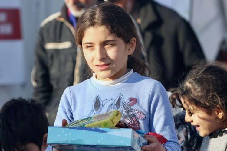 Üzerindeki notlarla Kahramanmaraş'a ulaşan oyuncaklar, 12 Şubat Stadyumu'na kurulan çadır kentte çocuklara hediye edildi.