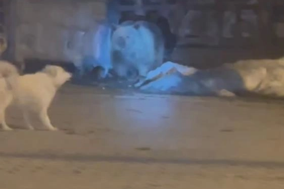 Uludağ Sarıalan'da kış uykusundan uyanan bir ayı, aç kalınca çöp konteynerlerine dadandı. Yemek arayışına çıkan ayı kovaları tek tek devirip yiyecek bulmaya çalıştı. Koruyucu köpekler tarafından rahatsız edilen ayı bir süre yemek arayıp, daha sonra ormanlık alana doğru kayıplara karıştı. O anlar bir vatandaşın kamerasına saniye saniye yansıdı.