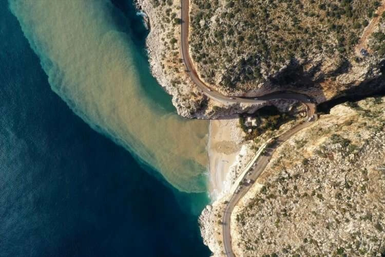 ANTALYA (AA) - Antalya'nın Kaş ilçesinde etkili olan yağışın ardından yüksek kesimlerden gelen çamurlu su, Kaputaş Plajı'nda denizin rengini değiştirdi.