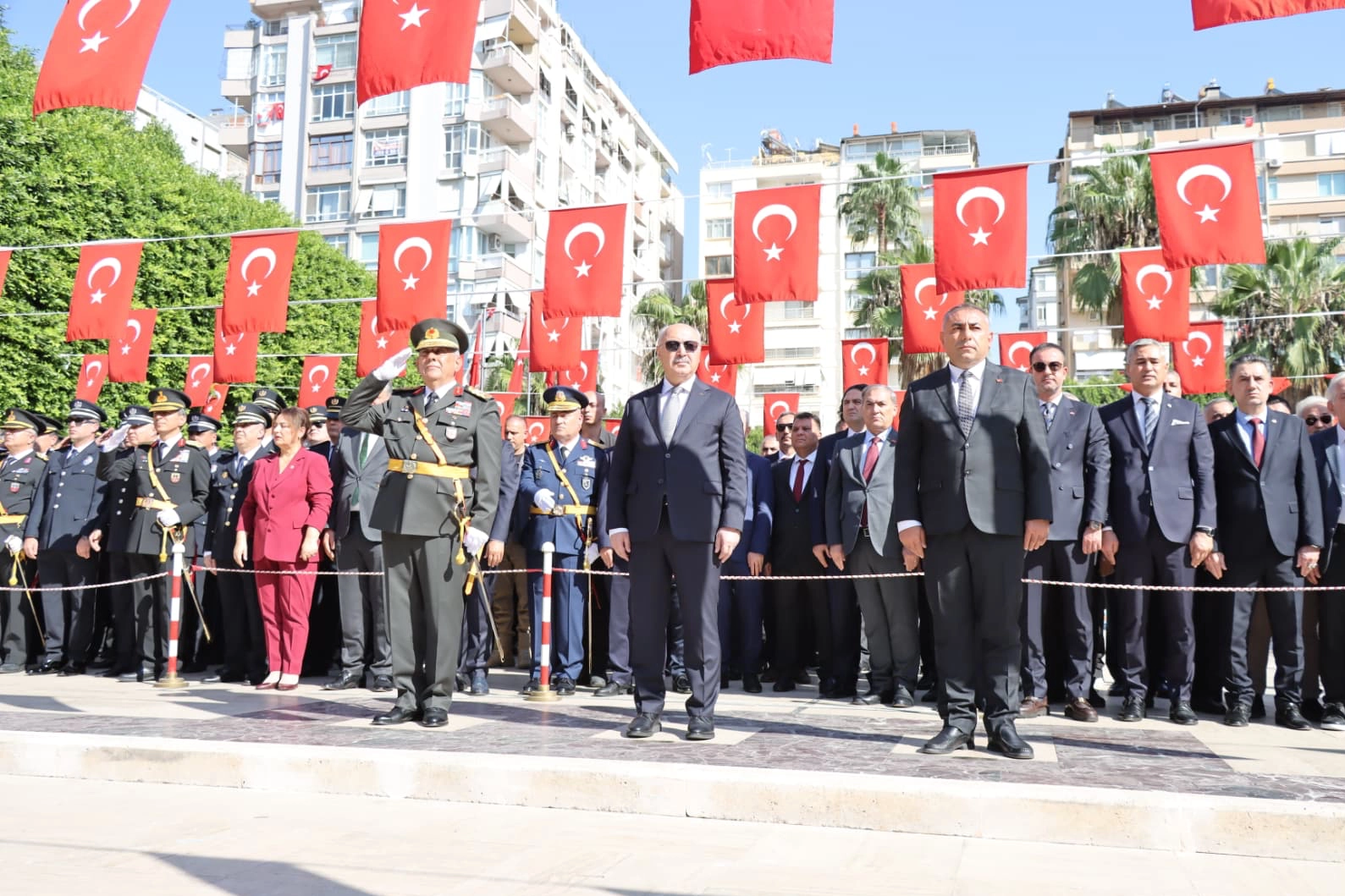 Adana Valisi Yavuz Selim Köşger, Adana Büyükşehir Belediye Başkan Vekili Güngör Geçer, 6’ncı Kolordu Komutanı Tümgeneral Mehmet Yasin Kalın, çelenk bıraktı. Ardından şehitler için bir dakika saygı duruşunda bulunularak, İstiklal Marşı okundu.