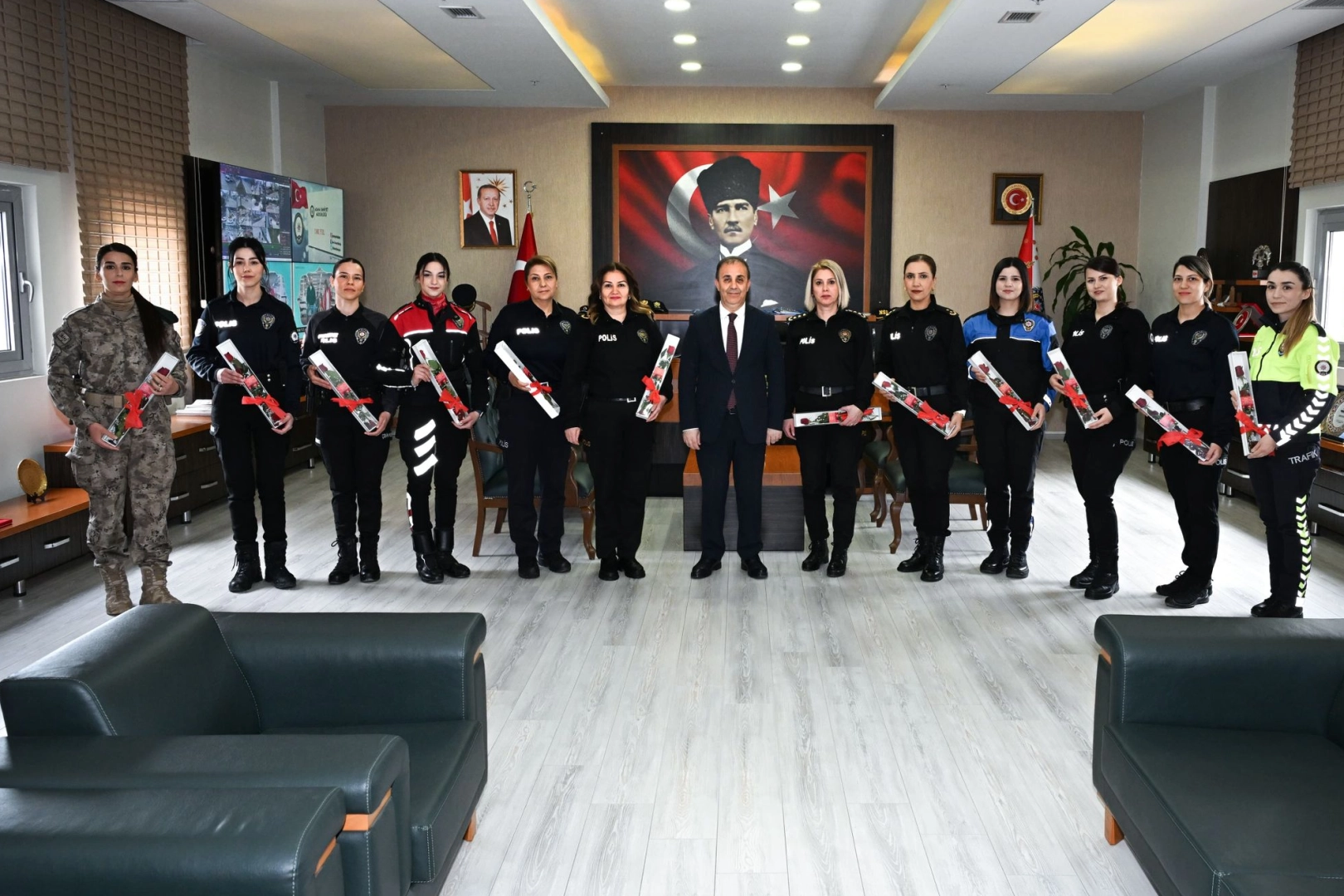 Adana İl Emniyet Müdürü Ahmet Hakan Arıkan, 8 Mart Dünya Kadınlar Günü dolayısıyla Adana Emniyet Müdürlüğü’nde görev yapan kadın polisleri makamında ağırlayarak günlerini kutladı. Program kapsamında kadın polislere gül takdim edilirken, günün anısına hatıra fotoğrafları çekildi. Arıkan, kadınların emniyet teşkilatındaki önemli rolüne dikkat çekerek, görevlerini özveriyle sürdüren tüm kadın personele başarılar diledi.