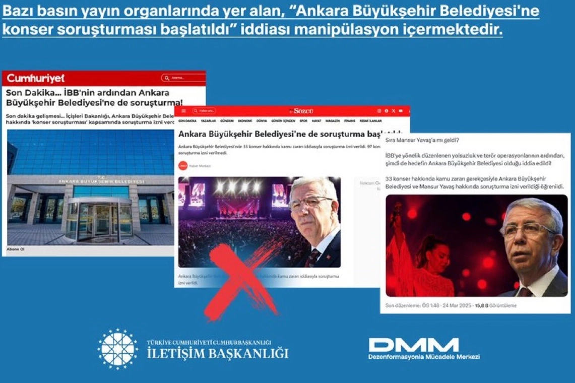 Son günlerde bazı basın organlarında yer alan “Ankara Büyükşehir Belediyesi'ne konser soruşturması başlatıldı” iddialarına ilişkin Dezenformasyonla Mücadele Merkezi (DMM) bir açıklama yaptı. Açıklamada, iddiaların manipülatif olduğu vurgulanırken, soruşturmanın Ankara Büyükşehir Belediye Başkanı Mansur Yavaş'ı değil, belediyedeki ilgili personeli kapsadığı belirtildi. İçişleri Bakanlığı mülkiye müfettişleri tarafından yürütülen inceleme sonucunda, 130 konser için yapılan hizmet alımlarına yönelik değerlendirmelerin tamamlandığı ve kamu zararı iddiasıyla 33 konser hakkında soruşturma izni verildiği ifade edildi.