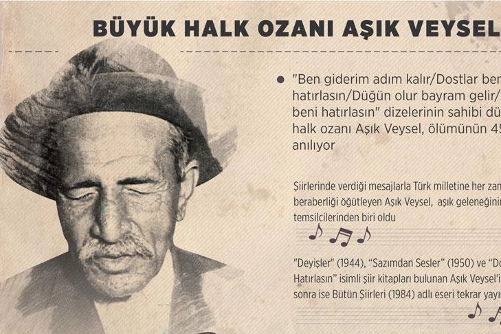 Halk ozanı Aşık Veysel'in vefatının üzerinden 51 yıl geçti. 25 Ekim 1894 tarihinde Sivas'ın Şarkışla ilçesinin Sivrialan Köyü'nde doğan Aşık Veysel, Türk halk ozanlarının en önemli temsilcilerinden biri olarak kabul edilir. Ünlü eserleri arasında "Uzun İnce Bir Yoldayım", "Dostlar Beni Hatırlasın", "Güzelliğin On Par Etmez", "Atatürk'e Ağıt", "Beni Hor Görme", "Beş Günlük Dünya", "Derdimi Dökersem Derin Dereye", "Kahpe Felek" ve "Kara Toprak" bulunmaktadır.