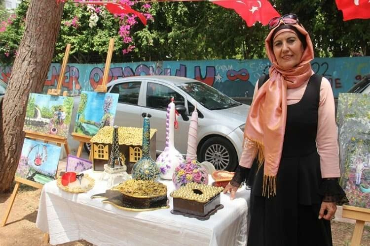 Bir birinden güzel resim tablolarının çıktığı kurslarda, engelli gençler buldukları atkıları tek tek boyayarak tekrar kullanabilir hale getirdi. Eski çöpe atılan tepsiler, kırık süs eşyaları da tek tek kurslarda elden geçirildi. Yep yeni hale getirilen atık maddeler tekrar kullanıma hazır duruma kavuşturulurken, yoğurt kapları boyanarak adeta özel üretilmiş bir saksı şeklini aldırıldı. Serginin en çok ilgi gören eserleri ise, çöpe atılan kırık aynaların görkemli bir hale getirilerek kullanıma sunulması ve fındık kabuklarıyla süslenmiş tahta parçalarından ekmeklik ve benzeri ürünler oldu.