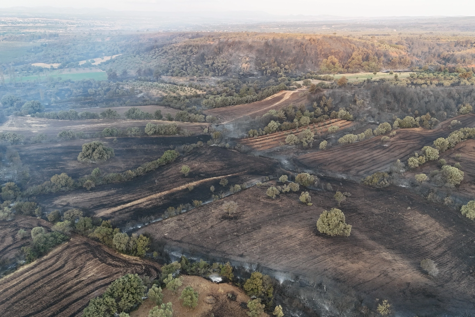 Yangında zarar gören ormanlık alan ve tarım arazileri dron ile görüntülendi. Ekiplerin bölgede soğutma çalışmaları sürüyor.