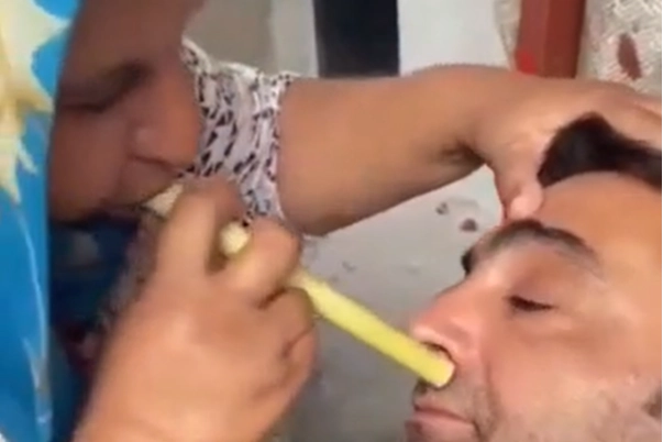Adana'da bir kadının hortumla yaptığı sıra dışı sinüzit tedavisi yöntemi kısa sürede sosyal medyada viral oldu. Görüntülerde, bir kadın, ağzına aldığı hortumu tedavi etmek istediği kişinin burnuna yerleştiriyor ve ardından adamın burnundan çıkanları hortum yoluyla plastik bir kaba tükürüyor.