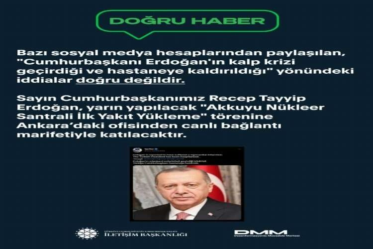İletişim Başkanlığı Dezenformasyonla Mücadele Merkezi, Cumhurbaşkanı Recep Tayyip Erdoğan’ın kalp krizi geçirdiği iddialarının doğru olmadığını açıkladı. Cumhurbaşkanlığı İletişim Başkanlığı Dezenformasyonla Mücadele Merkezi, sosyal medya hesabından paylaşım yaparak, “Bazı sosyal medya hesaplarından paylaşılan ‘Cumhurbaşkanı Erdoğan'ın kalp krizi geçirdiği ve hastaneye kaldırıldığı’ yönündeki iddialar doğru değildir. Sayın Cumhurbaşkanımız Recep Tayyip Erdoğan, yarın düzenlenecek ‘Akkuyu Nükleer Santrali İlk Yakıt Yükleme’ törenine canlı bağlantı marifetiyle katılacaktır” ifadelerini kullandı.