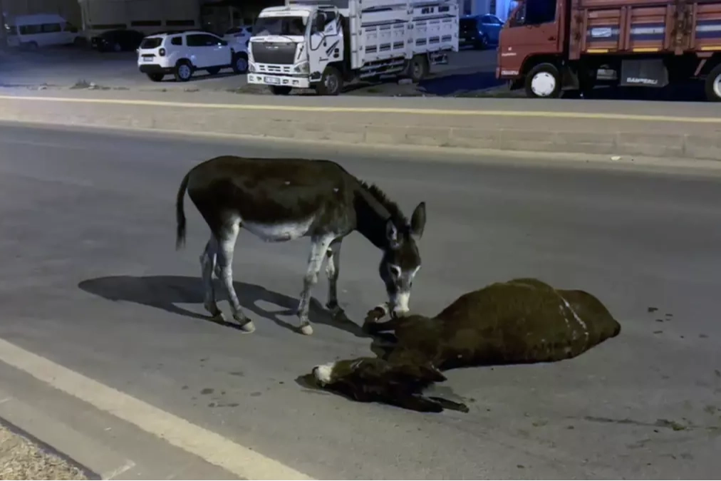 Mardin'in Derik ilçesinde dün akşam yaşanan bir trafik kazası, görenlerin yüreğini sızlatan bir görüntüye sahne oldu. Bir otomobilin çarpması sonucu hayatını kaybeden eşeğin yavrusu, annesinin cansız bedeninin başından bir an olsun ayrılmadı.