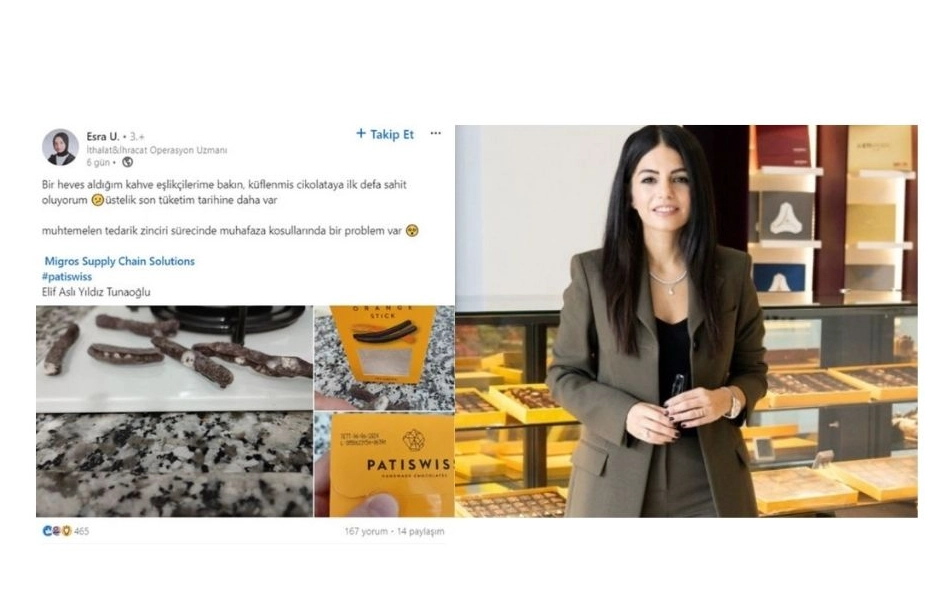 Sosyal medya platformlarından birinde, bir tüketici, süpermarketten aldığı Patiswiss marka çikolataların küflenmiş olduğunu gösteren fotoğraflar paylaştı. Ancak bu paylaşım, markanın yönetim kurulu başkanı Elif Aslı Yıldız Tunaoğlu'nun sert ve alaycı bir yanıtıyla karşılandı.