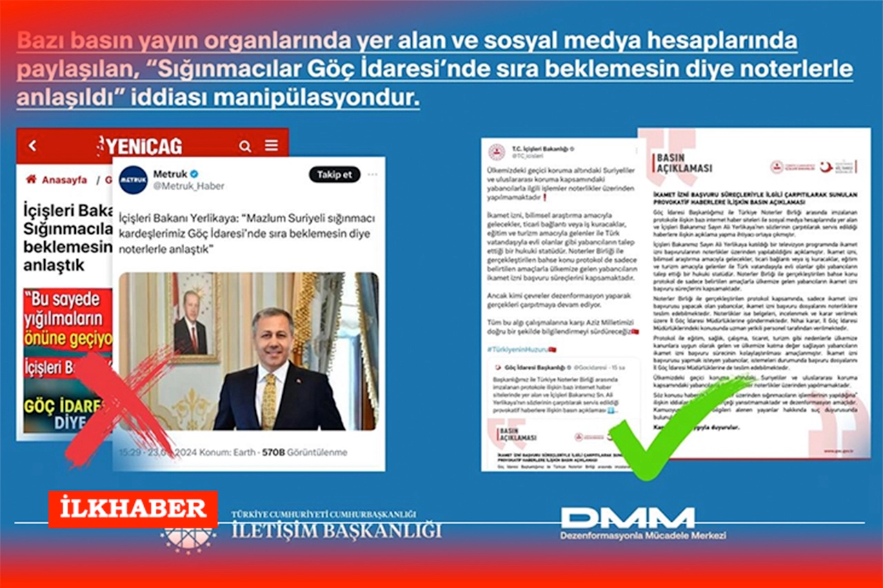 İletişim Başkanlığı'ndan yapılan açıklamada, "Sığınmacılar Göç İdaresi'nde sıra beklemesin diye noterlerle anlaşıldı" iddiasının gerçeği yansıtmadığı belirtildi. Dezenformasyonla Mücadele Merkezi'nden yapılan açıklamada, İçişleri Bakanı Ali Yerlikaya'nın bir televizyon programında yaptığı açıklamalara dikkat çekilerek, noterliklerle yapılan protokolden kasıtın sığınmacılar değil, bilimsel araştırma, ticaret, eğitim ve turizm amaçlı ülkemize gelen yabancılar olduğu vurgulandı.