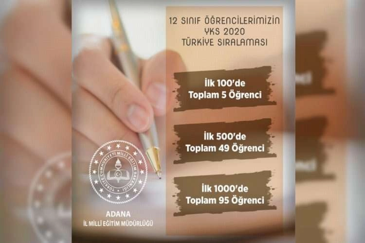 Adana İl Milli Eğitim Müdürlüğü verilerine göre, Adanalı öğrenciler 2020 Yükseköğretim Kurumları Sınavı’nda büyük bir başarıya imza attı. YKS Türkiye sıralamasında ilk 100’de Adanalı 5 öğrenci yer alırken, ilk 500’de 49 öğrenci sıralamaya girdi. İlk binde ise toplam 95 öğrenci sıralamadaki yerlerini aldı.