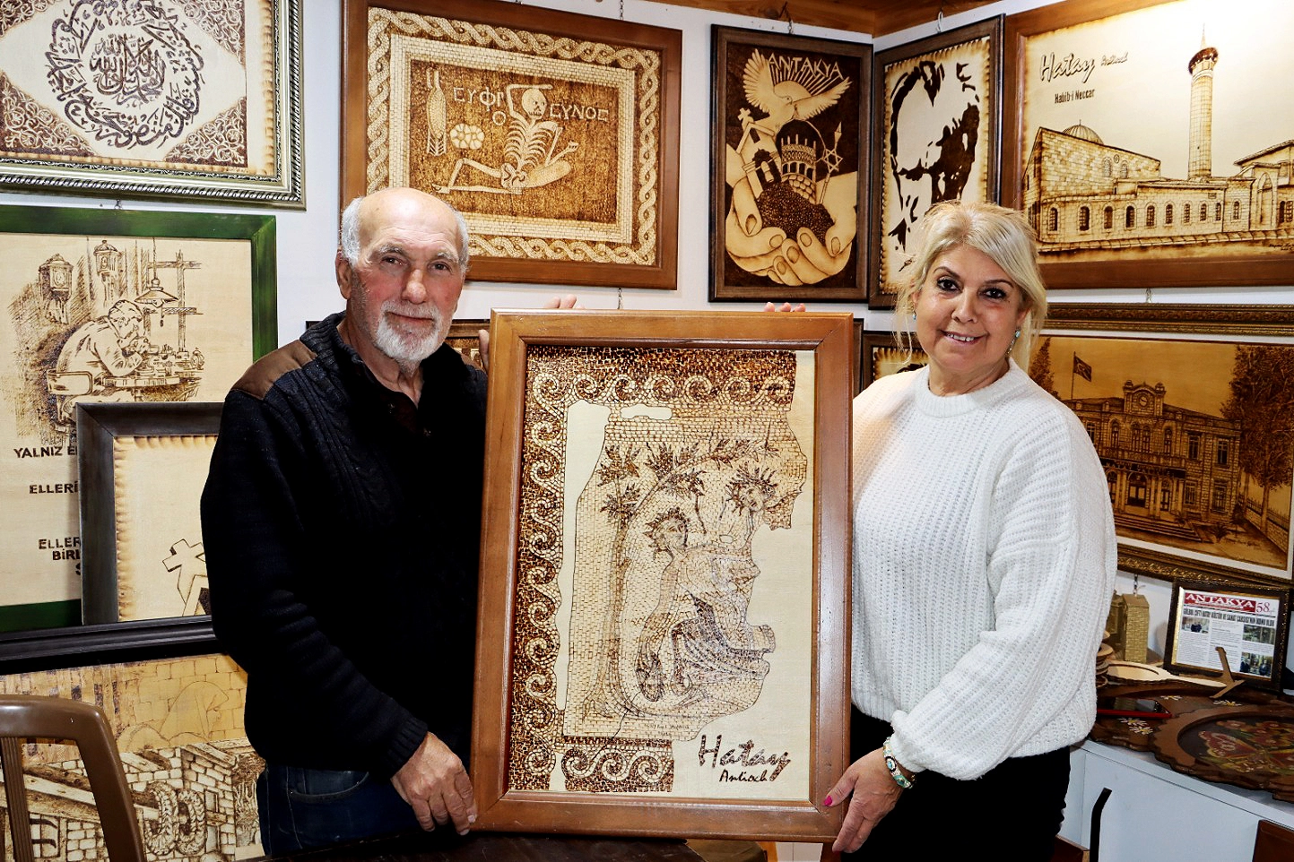 Zeynep ve Naim Gülbol çifti, yakma resim sanatındaki ustalıklarını yıllara yayılan bir emekle sürdürmeye devam ediyor. Özgün çalışmalarıyla tanınan sanatçılar, bu kez Hatay Arkeoloji Müzesi’nde sergilenen dünyaca ünlü mozaikleri ahşap yüzeylere aktararak dikkat çeken bir projeye imza attı.