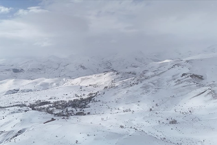 Ekiplerin iş makinesinin boyunu geçen karla mücadele çalışmaları ve beyaz örtü altındaki yayla ile dağlık coğrafya, dronla görüntülendi.