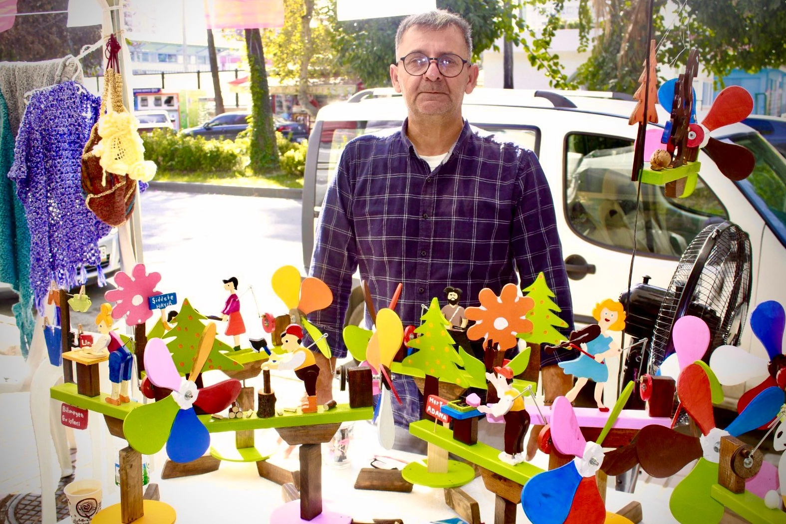 Mersin’in Tarsus ilçesinde yaşayan Murat Sönmez, 7 yıl önce oğlu için yaptığı ahşap oyuncakla başladığı yolculuğu mesleğe dönüştürdü. Ahşap oyuncaklara artan ilgiyi fark eden Sönmez, evinin alt katını atölyeye çevirerek üretime başladı. Oğlu ile birlikte tasarladığı oyuncaklar, şimdi Adana Büyükşehir Belediyesi’nin Kadın Emeği Pazarı’nda 3 gün boyunca ziyaretçilerini bekliyor. Sönmez, “Ahşap oyuncakları tasarlarken çocukluğumuzun figürlerinden Şirinler ve farklı çizgi film kahramanlarıyla birlikte Adana’ya özgü kebap figürlerinden ilham alıyoruz” dedi.