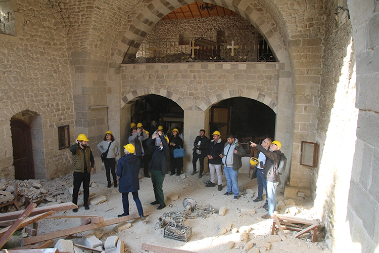 Papaz Yuhanna Papazoğlu ile görüşen heyet, Kahramanmaraş merkezli 6 Şubat 2023'teki depremde hasar alan kiliseyi ve çevresini fotoğrafladı.