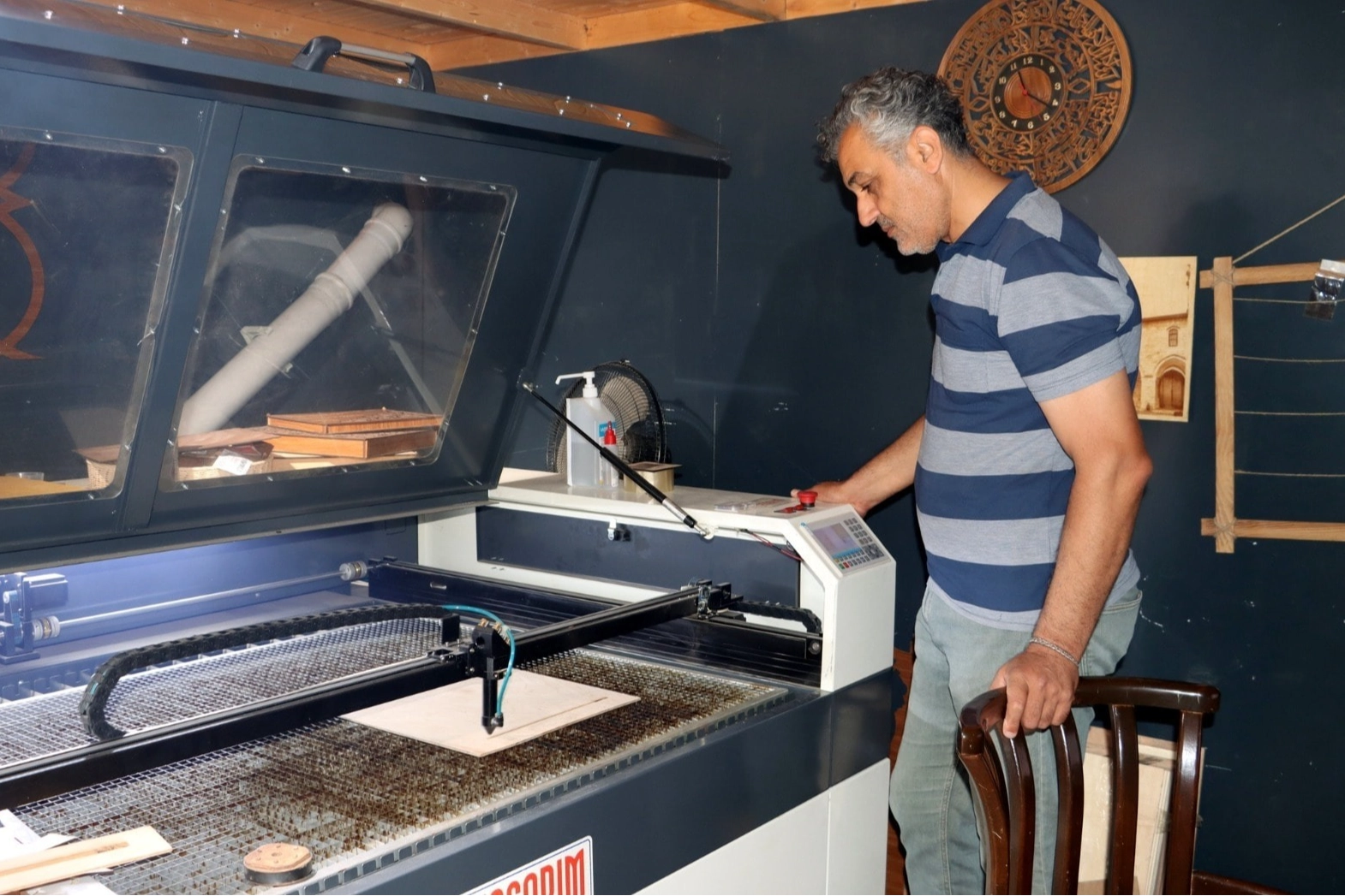 Sanatçı İsmail Demirel’in elinden çıkan bu eserler, geçmişe duyulan saygının ve geleceğe dair umutların simgesi olarak dikkati çekiyor. Demirel, lazer teknolojisiyle en ince detayına kadar işlediği tablolarında, Antakya’nın simge yapıları arasında yer alan Habib-i Neccar Camii, Ortodoks Kilisesi, Meclis Binası ve Affan Kahvesi gibi önemli kültürel yapıtları tasvir ediyor.