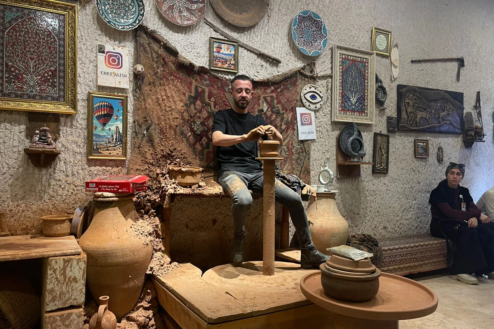 Avanos’un simgesi haline gelen çanak ve çömlek yapımı, bölgeye özgü kırmızı kil kullanılarak gerçekleştiriliyor. Atölyeye gelen ziyaretçilere önce kil temin ediliyor, ardından ustalar eşliğinde çamur şekillendirilmeye başlanıyor. Geleneksel “ayak çarkı” yöntemiyle yapılan çömlekler, katılımcıların ellerinde şekil buluyor.