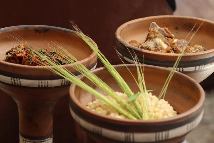 Usta şef menüsünde, Şanlıurfa'nın doğal buğdaylarından hazırlanan ekmek, yanık sadeyağ, koyun yoğurdu, mevsim otları, buğday lapası, kuzu kemikli et, az kavrulmuş Karacadağ pirincinden yaptığı yemekleri Karahantepe'de ilk kez sundu.