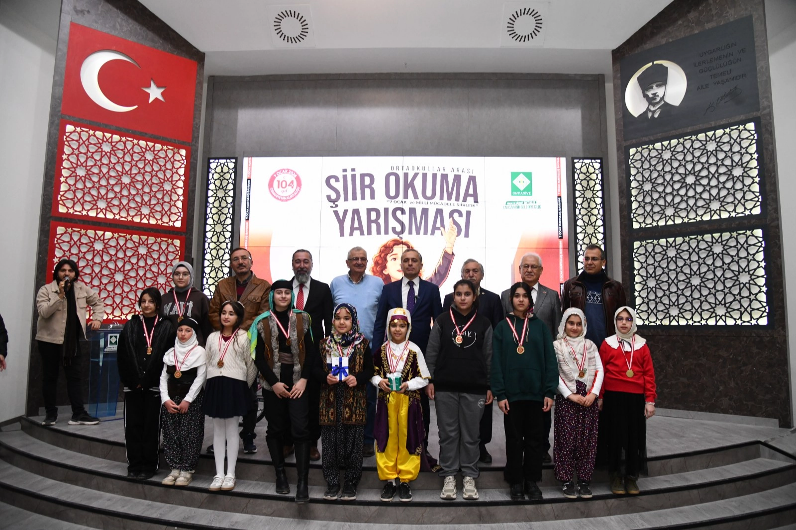 DERECEYE GİREN ÖĞRENCİLER BELLİ OLDUJüri üyelerinin yaptığı puanlama sonucunda dereceye giren isimler belirlendi. Şehit Bekir Evren İmam Hatip Ortaokulu öğrencisi Hatice Feyza Didin, Mehmet Akif Ersoy’un "Ye’s" şiiriyle sergilediği performans sonucu birinciliği elde etti. Remzi Özer Yatılı Bölge Ortaokulu’ndan Durdane Deniz Yur, "Osmaniye’nin Kurtuluşu" adlı şiiriyle ikinci olurken, 75. Yıl Ortaokulu’ndan Asya Yılık ise "Mustafa Kemal’in Kağnısı" adlı eseriyle üçüncü sırada yer aldı. Sonuçların açıklanmasının ardından ilk üç dereceyi paylaşan öğrencilere ödüllerini Belediye Başkanı İbrahim Çenet ve Ak Parti İl Başkan Vekili Muhammet Doğan takdim ederken, diğer katılımcılara madalyaları jüri üyeleri tarafından verildi.