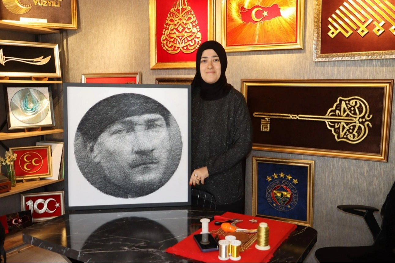 Hatay’ın tek String Art sanatçısı Alev Konç, Ulu Önder Mustafa Kemal Atatürk’ün portresini de bu özel teknikle işleyerek sanatseverlerin beğenisine sundu. Binlerce çivi ve metrelerce ip kullanılarak titizlikle hazırlanan eser, detayları ve gerçekçiliğiyle büyük hayranlık uyandırdı.