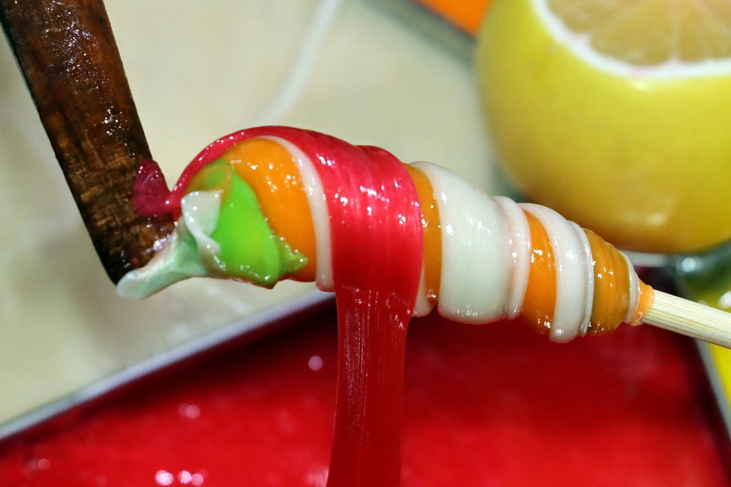 Limon, elma, portakal, muz ve çilek gibi doğal meyvelerden elde edilen karışımı ustalıkla hazırlayan Coşkuner, macunu geleneksel yöntemle tahta çubuğa sararak müşterilerine sunuyor. Çubuğun hızlıca çevrilmesiyle ortaya çıkan renkli ve kıvamlı macun, bir anlamda görsel şölen sunuyor.