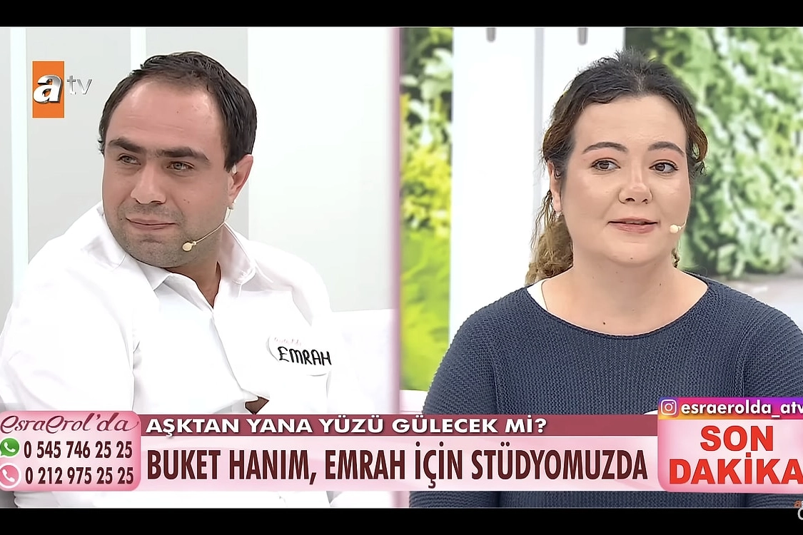 Esra Erol ise Emrah’ın duygusal çöküntüsüne kayıtsız kalmayarak, izleyicilerden Emrah’a olan ilgisini dile getiren sayısız mesaj aldığını açıkladı. Bu mesajlardan bir tanesi de stüdyoya kadar taşındı. Buket adında bir izleyici, Emrah’ı ekrandan gördüğünü ve çok beğendiğini belirterek tanışmaya geldi. “Ekranda gördüğüm gibi çok yakışıklı, tanışmak istiyorum” diyen Buket, Emrah’la dışarıda görüşmek üzere sözleşti.