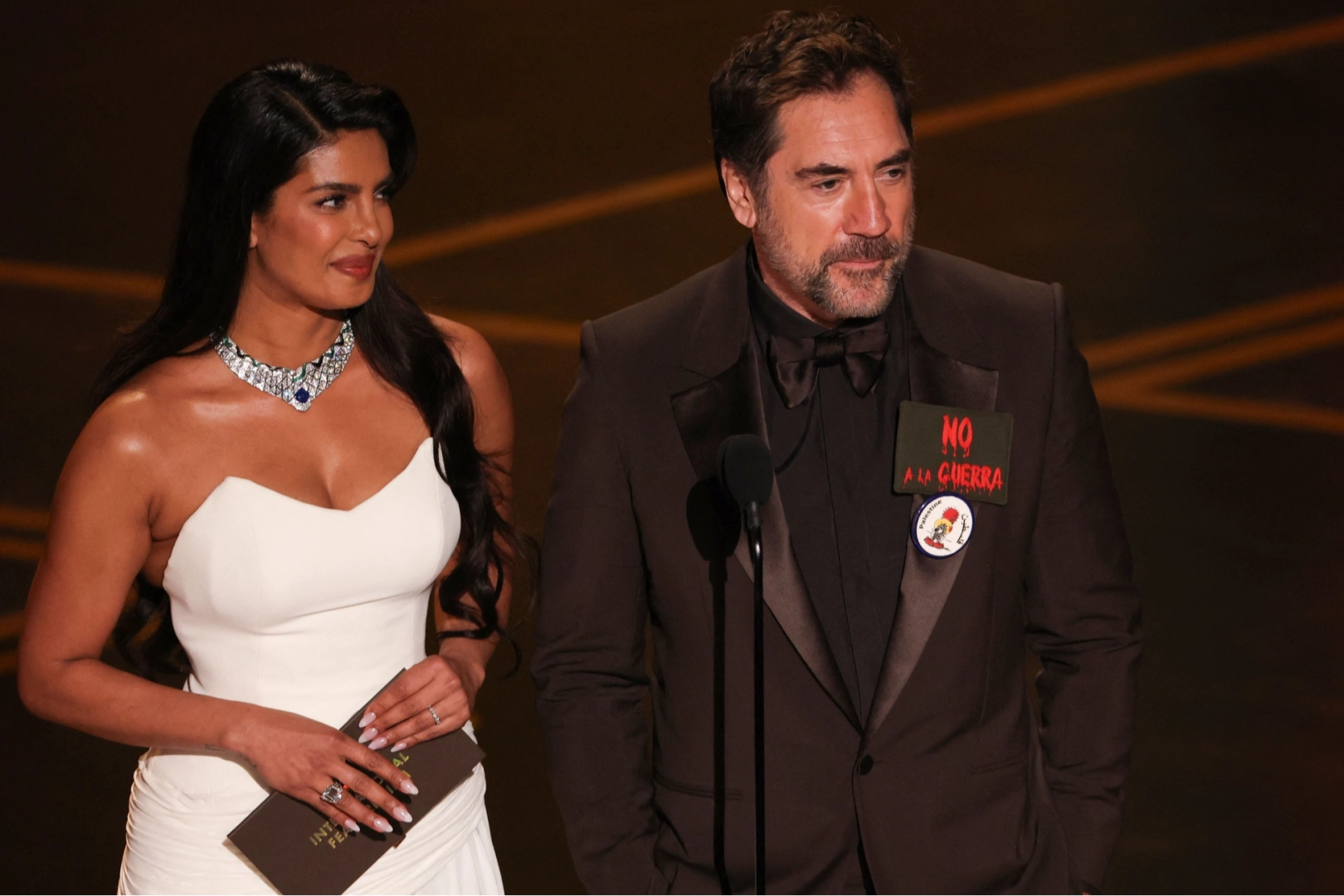 BARDEM'İN YAKASINDAKİ ROZETLERİN SIRRITörenin en çok konuşulan detaylarından biri de Bardem'in kıyafetindeki simgeler oldu. Ünlü aktörün yakasında İspanyolca olarak 'Savaşa Hayır' ve 'Filistin' yazılı iki ayrı rozet taşıdığı görüldü. 2008 yılında 'No Country For Old Men' (İhtiyar Adamlara Yer Yok) filmiyle Oscar heykelciğini kucaklayan oyuncu, bu eylemiyle sadece sahnede değil, kırmızı halıda da odak noktası haline geldi. Sembolik aksesuarlarıyla dikkat çeken Bardem, bu tutumuyla ülkesi İspanya'nın insani krizler karşısındaki diplomatik yaklaşımını sanat platformuna taşıdı.