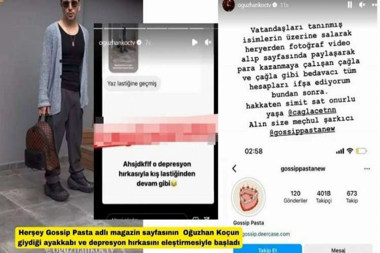 (Haber Merkezi)- Demet Özdemir'le evliliği 8 ay süren Oğuzhan Koç, son dönemde gergin tavırlarıyla dikkat çekiyor. Oğuzhan Koç, instagram üzerinden kendisini eleştiren Gossip Pasta isimli hesabı ifşa etti. Anonim hesap olan 'Gossippasta'nın Koç'un ayakkabılarını eleştirmesi üzerine çılgına dönen şarkıcı, adeta ateş püskürdü. Gossippasta'yı ifşa edip, ağır sözler sarfeden Oğuzhan Koç'a tepki yağdı. İşte ayrıntılar... Demet Özdemir'le evliliği sadece 8 ay süren Oğuzhan Koç, son dönemde gergin tavırlarıyla dikkat çekiyor. Oğuzhan Koç, instagram üzerinden kendisini eleştiren Gossip Pasta isimli hesabı ifşa etti. Anonim hesap olan 'Gossippasta'nın Koç'un ayakkabılarını eleştirmesi üzerine çılgına dönen şarkıcı, adeta ateş püskürdü. Gossippasta'yı ifşa edip, ağır sözler sarfeden Oğuzhan Koç'a tepki yağdı.