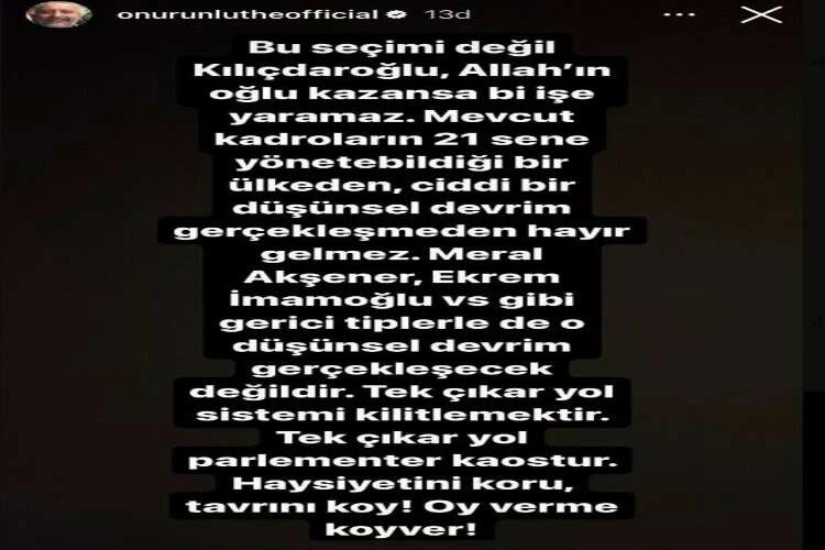 "HAYSİYETİNİ KORU, TAVRINI KOY OY VERME"Ünlü, paylaşımında "Bu seçimi değil Kılıçdaroğlu, Allah'ın oğlu kazansa bir işe yaramaz. Mevcut kadroların 21 sene yönetebildiği bir ülkeden, ciddi bir düşünsel devrim gerçekleşmeden hayır gelmez. Meral Akşener, Ekrem İmamoğlu vs gibi gerici tiplerle de o düşünsel devrim gerçekleşecek değildir. Tek çıkar yol sistemi kilitlemektir. Tek çıkar yol parlamenter kaostur. Haysiyetini koru, tavrını koy! Oy verme koy ver" ifadelerini kullandı.