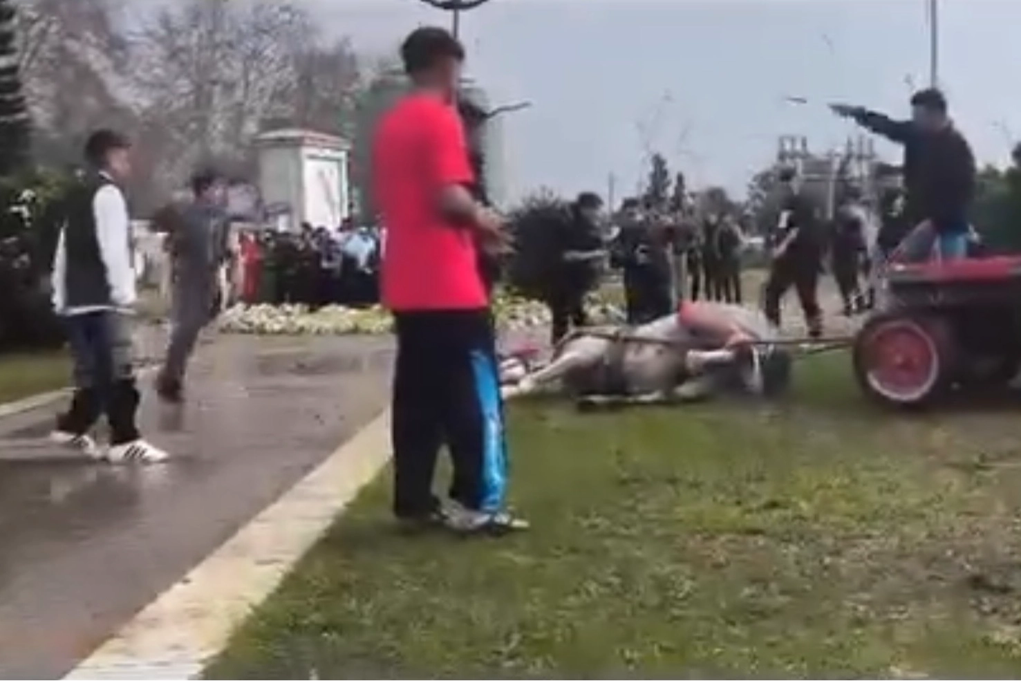 Ramazan Bayramı'nın ilk günü bir grup Adana'nın Seyhan ilçesindeki Merkez Park'a atlarıyla geldi. İsmi öğrenilemeyen bir kişi, koşmadığı için öfkelendiği atına sopa, tekme ve yumrukla vurdu. Aldığı darbelerle sersemleyen at, bir süre sonra yere yığıldı. Çevredekilerin tepki gösterdiği kişi, arabaya bağlı olan atının iplerini çözmeye çalıştı. O anlar cep telefonu kamerasıyla görüntülendi.
